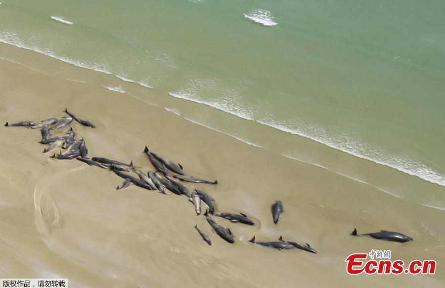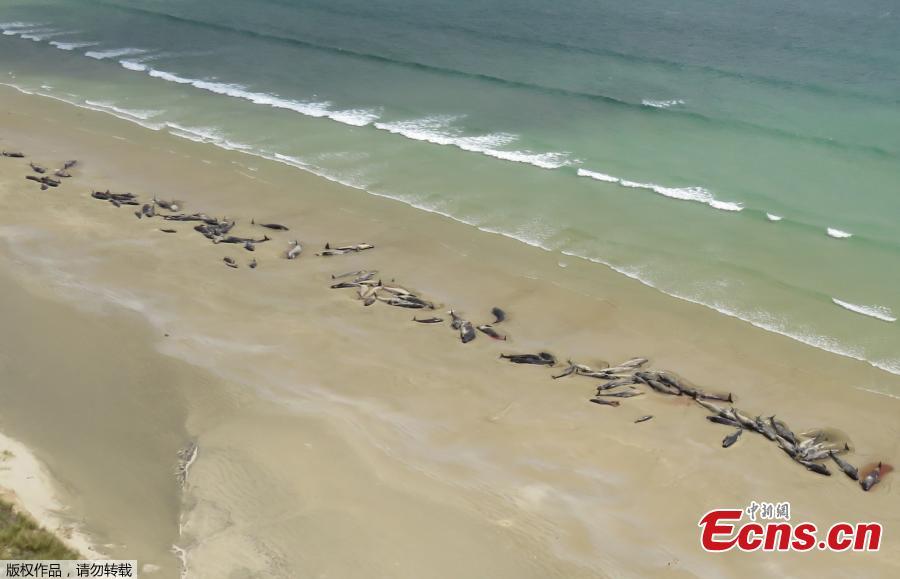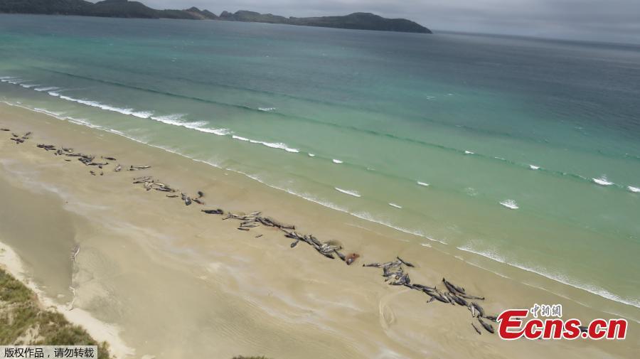 This photo taken and released on November 26, 2018 from the New Zealand Department of Conservation shows dead pilot whales on a remote beach on Stewart Island in the far south of New Zealand. Up to 145 pilot whales have died in a mass stranding on a remote part of a small New Zealand island, authorities said on November 26. (Photo/Agencies)