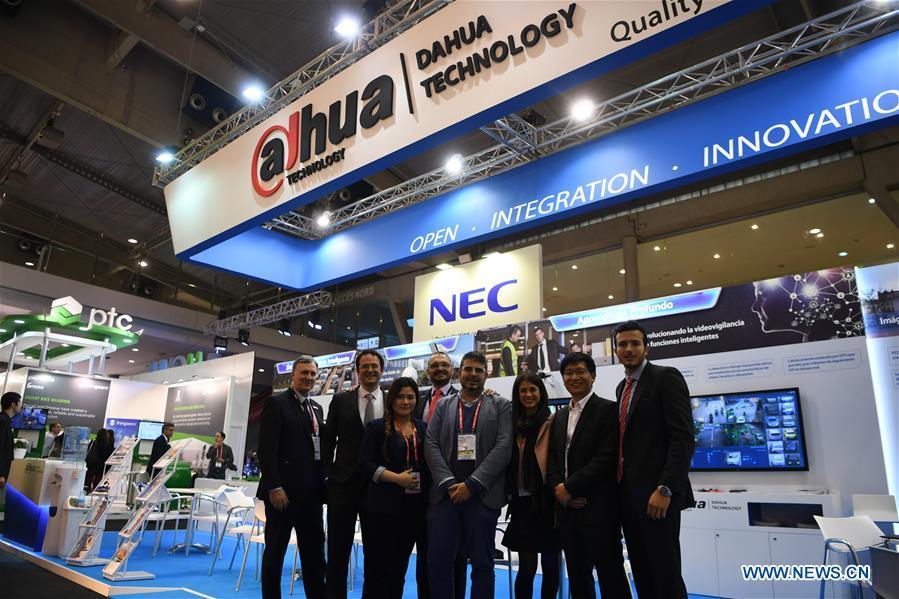 Staff members of Zhejiang Dahua Technology Co. Ltd. pose for a group photo during the Smart City Expo World Congress in Barcelona, Spain, on Nov. 15, 2017. More and more Spanish consumers accept Chinese high-tech brands, which now can be seen in daily life across Spain.(Xinhua/Guo Qiuda)