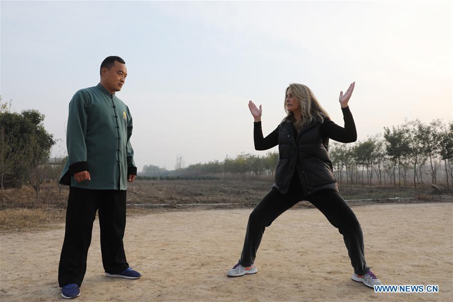 Ana Fidalgo practices Taiji in Chenjiagou Village of Wenxian County, central China's Henan Province, Nov. 25, 2018. Ana, who comes from Sao Paulo, Brazil, loves Chinese culture, and is a fan of Taiji. It's the third time that she comes to Chenjiagou Village to study Taiji. She has taught what she has learned in China in her hometown when coming back to Brazil in recent years, hoping to benefit more people. (Xinhua/Xu Hongxing)