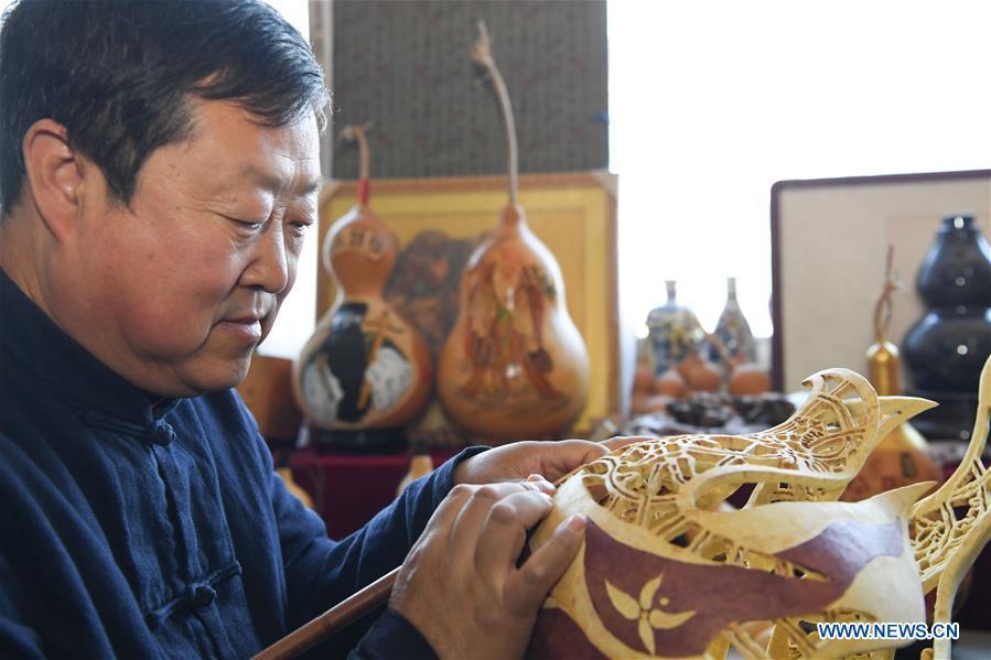 Wang Guowei carves gourd handicraft at his studio in Tieling, northeast China's Liaoning Province, Nov. 26, 2018. Wang Guowei who is adept in painting was awarded provincial-level handicraft master title for producing exquisite gourd handicrafts with vivid images. (Xinhua/Long Lei)