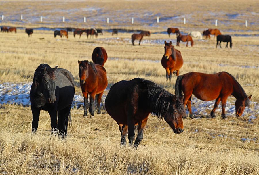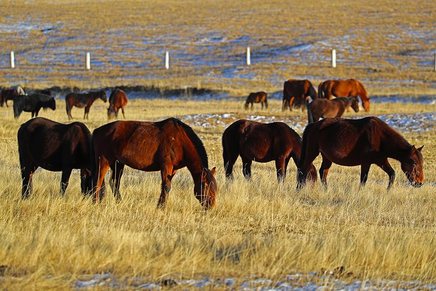 Horses graze on the prairie at the Shandan Military Horse Farm, NW China's Gansu Province, during the winter. (Photo by Cheng Lin for chinadaily.com.cn)