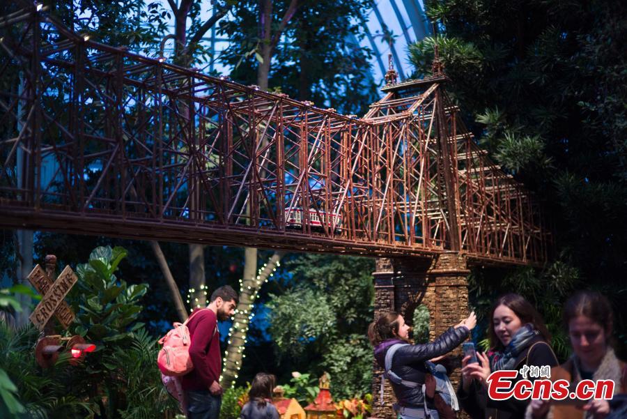Visitors are attracted by model trains navigating painstakingly crafted miniatures of New York City’s built environment, all made entirely out of plant parts at Holiday Train Show in New York on December 1, 2018. At the show, model trains zip through a display of more than 175 New York landmarks, each re-created with bark, leaves, and other natural materials. (Photo: China News Service/Liao Pan)