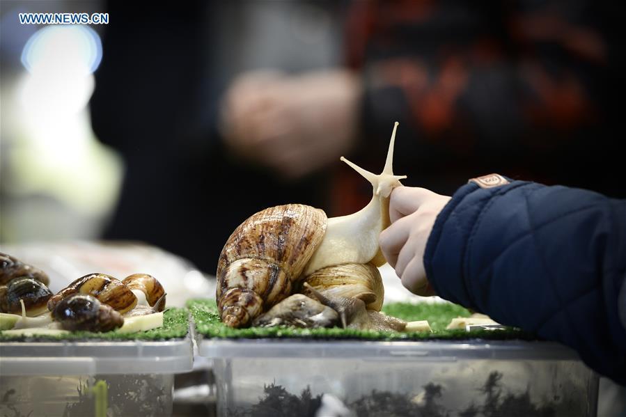 A visitor touches a giant snail at the Exotic Zoo in Warsaw, Poland on Dec. 2, 2018. The Exotic Zoo is a one-day event where people can see, touch and buy exotic reptiles, insects, amphibians and arthropods. The exhibition attracted hundreds of visitors on Sunday. (Xinhua/Jaap Arriens)