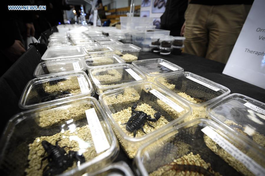 Scorpions are seen at the Exotic Zoo in Warsaw, Poland on Dec. 2, 2018. The Exotic Zoo is a one-day event where people can see, touch and buy exotic reptiles, insects, amphibians and arthropods. The exhibition attracted hundreds of visitors on Sunday. (Xinhua/Jaap Arriens)