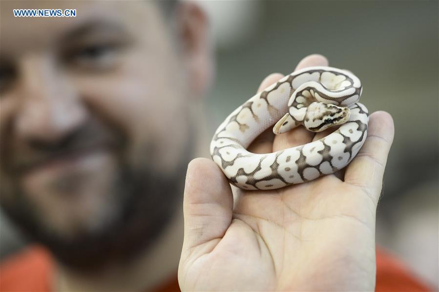 A visitor holds a snake on his hand at the Exotic Zoo in Warsaw, Poland on Dec. 2, 2018. The Exotic Zoo is a one-day event where people can see, touch and buy exotic reptiles, insects, amphibians and arthropods. The exhibition attracted hundreds of visitors on Sunday. (Xinhua/Jaap Arriens)