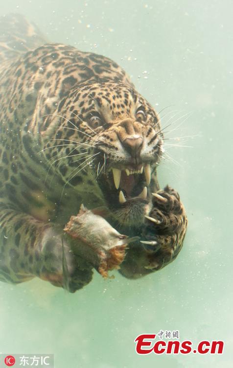 A jaguar dives underwater to catch its dinner. With teeth bared, claws drawn and eyes focused the stunning predator dives for fish that had been thrown into the water at the Zoo de Bordeaux Pessac in France. (Photo/IC)