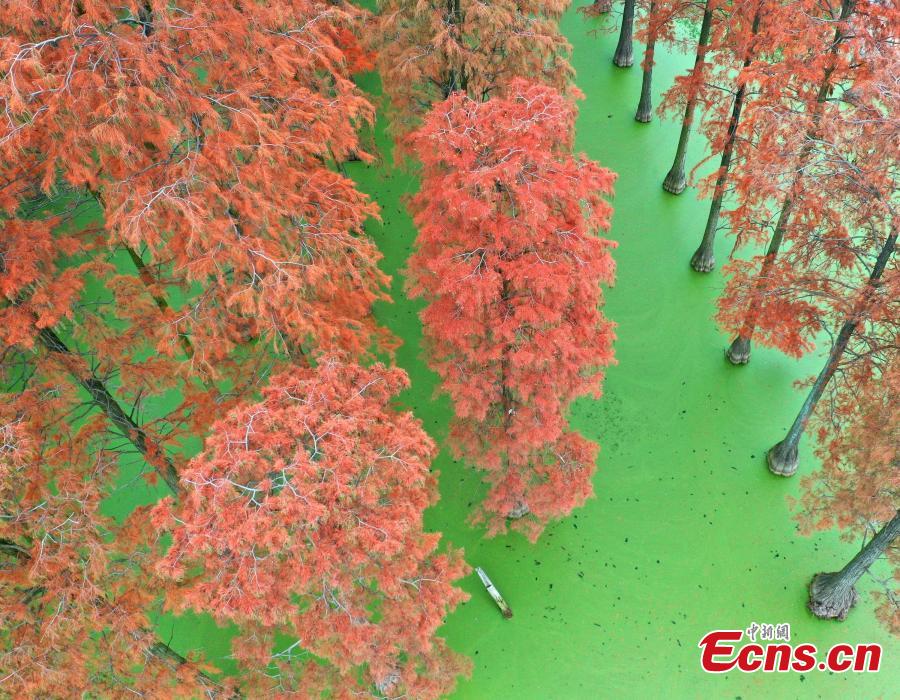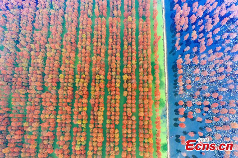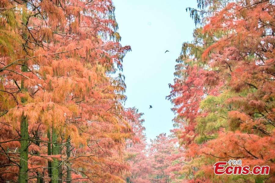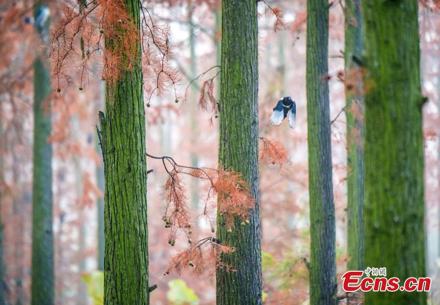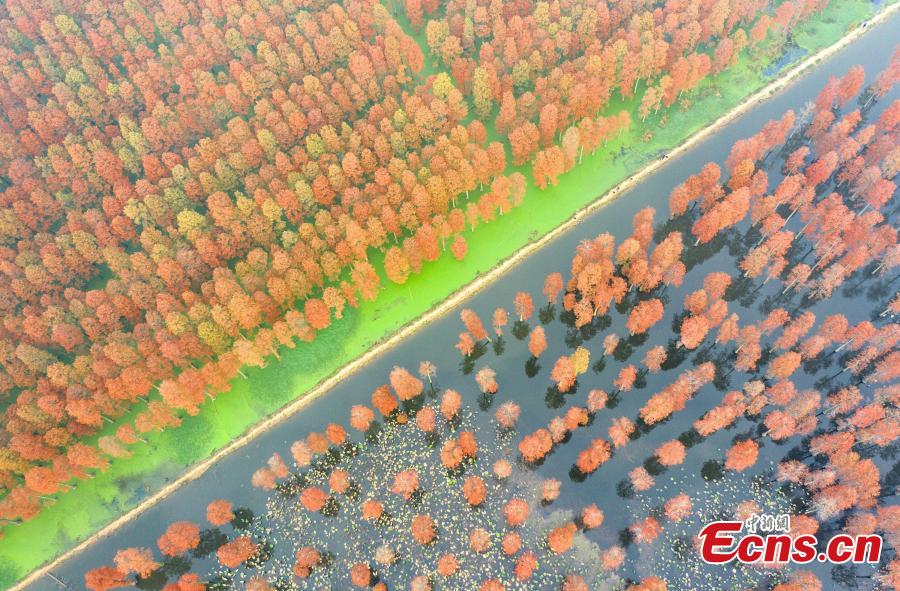 The photo taken on December 1, 2018 shows tens of thousands of Chinese sequoias, growing in one-meter-deep water at Zhangdu Lake Wetland in Wuhan City, central China's Hubei Province. (Photo/China News Service)