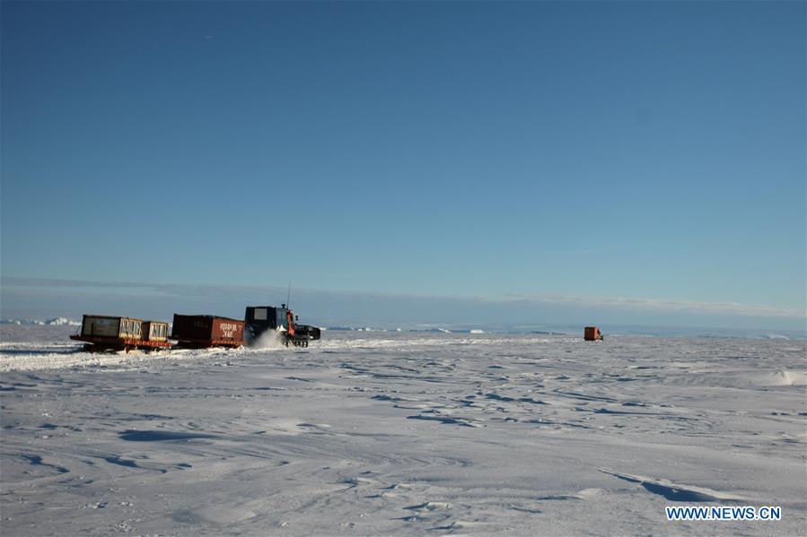 Snowmobiles loaded with supplies head for the Zhongshan station in Antarctica, Dec. 2, 2018. China's research icebreaker Xuelong, also known as the Snow Dragon, is now 44 kilometers away from the Zhongshan station. Unloading operations have been carried out after the routes were determined. (Xinhua/Liu Shiping)