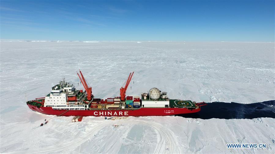 Aerial photo taken on Dec. 3, 2018 shows China's research icebreaker Xuelong in Antarctica. China's research icebreaker Xuelong, also known as the Snow Dragon, is now 44 kilometers away from the Zhongshan station. Unloading operations have been carried out after the routes were determined. (Xinhua/Liu Shiping)