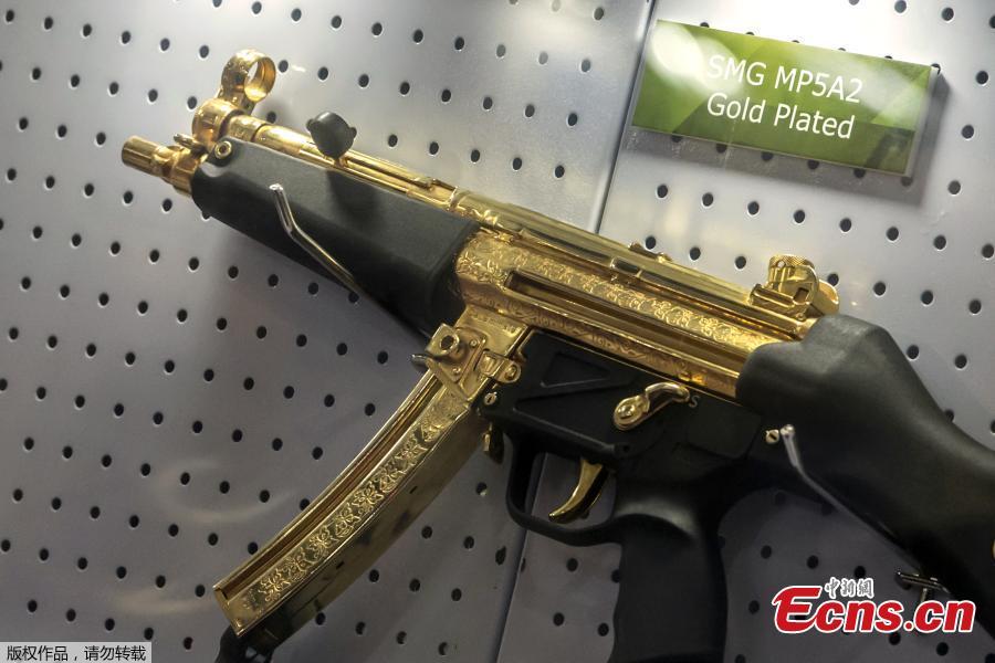 A gold plated weapon is displayed at the Pakistani stand during Egypt's first Service Defence Exhibition in Cairo on December 3, 2018, at the International Exhibition Center. (Photo/Agencies)