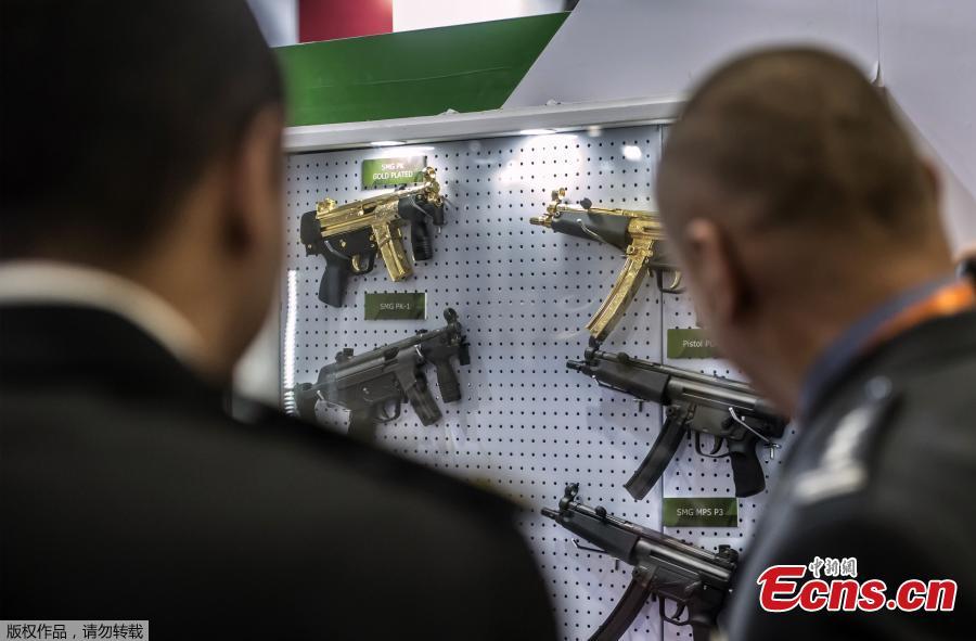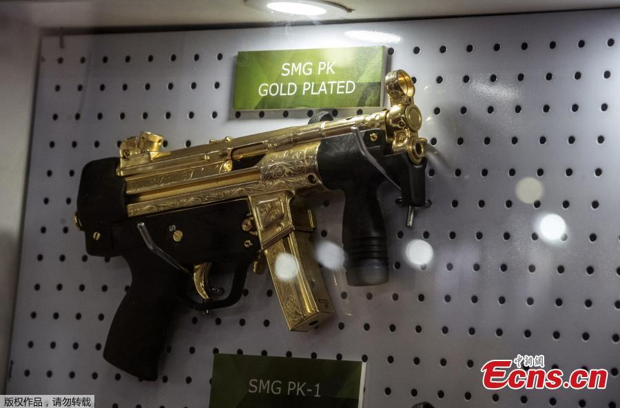 Gold plated weapons are displayed at the Pakistani stand during Egypt's first Service Defence Exhibition in Cairo on December 3, 2018, at the International Exhibition Center.(Photo/Agencies)