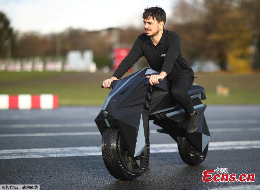 Designer Marco Mattia Cristofori of the German 3D printer manufacturer BigRep, rides his nearly completely 3D printed e-motorcycle NERA, at the airfield Tempelhof in Berlin, Germany, December 3, 2018.(Photo/Agencies)
