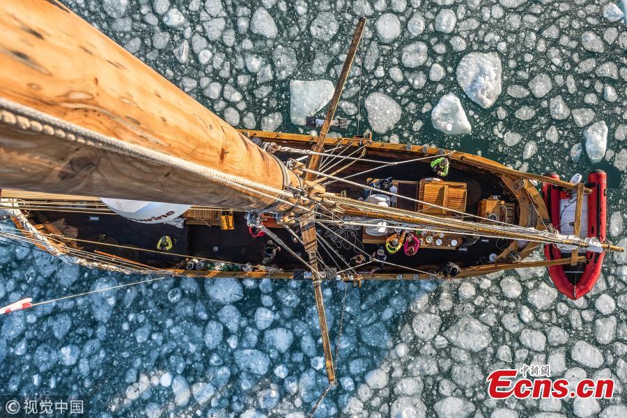British photographer James Rushworth captured the moment when a schooner passed by a giant iceberg off the east coast of Greenland. The 108-foot-long schooner was dwarfed by the 300-foot-tall turquoise iceberg. The 32-year-old photographer braved temperature of minus 10 degrees Celsius as he waited for the vessel to reach the center of the arch of the iceberg. (Photo/VCG)