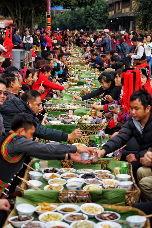 To celebrate the festival, one of the group's most important festivals, people from the province's Honghe county arranged a long-table banquet, which extended for about 3 kilometers and included over 4,000 tables.