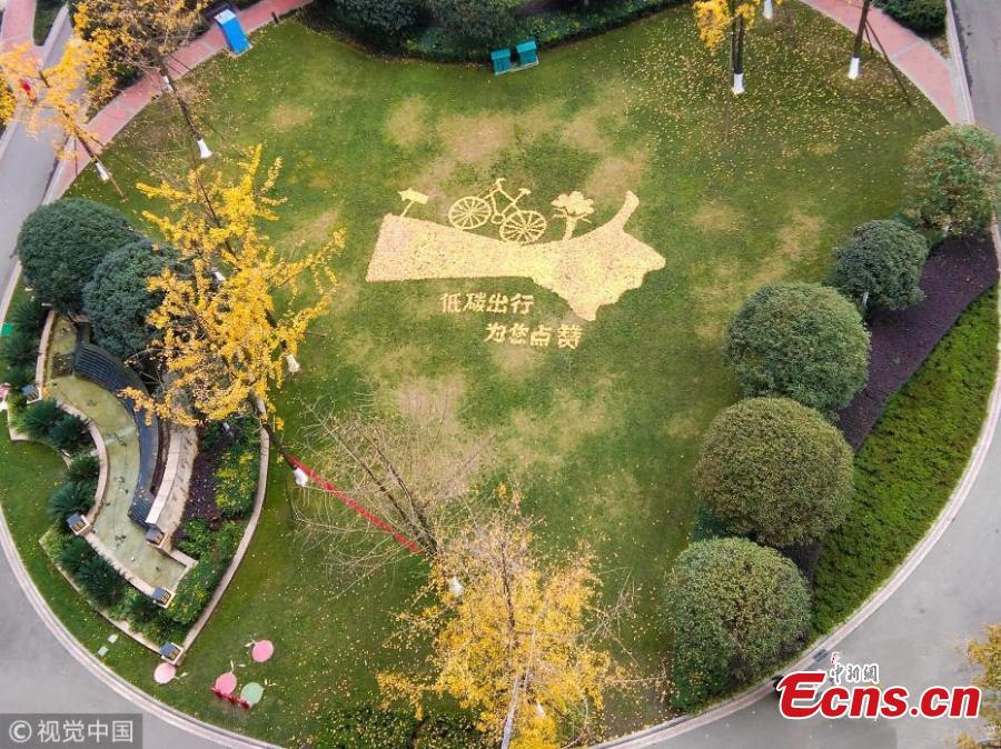 Sanitation workers collect fallen leaves and use them to form various patterns on ground in Qingyang district of Chengdu, Southwest China’s Sichuan province on December 4, 2018. (Photo/VCG)