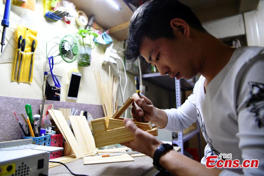Xu Ruibin shows a creation made using bamboo skewers at his wonton restaurant in Shijiazhuang City, Hebei Province, Dec. 10, 2018. Xu said he taught himself the handicraft in three months and is now able to make various designs. In the past two years, he has created over 300 works, including landmark buildings and elaborate villa miniatures. (Photo: China News Service/Zhai Yujia)