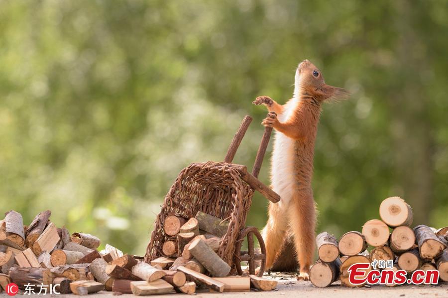 A wild squirrel unloads logs off a cart. The surreal pictures show the squirrels hard at work cutting the stick into tiny logs before wheeling them from their pile over to the stove.(Photo/IC)