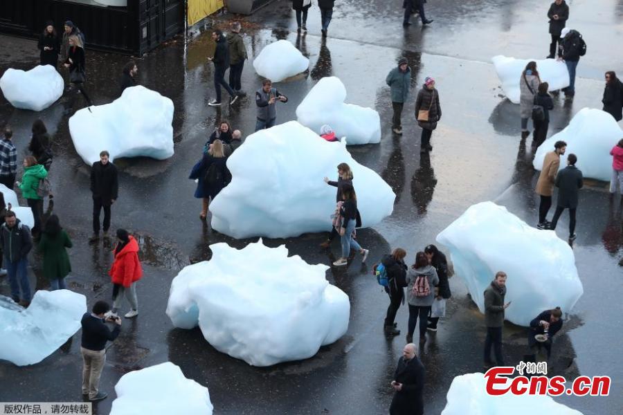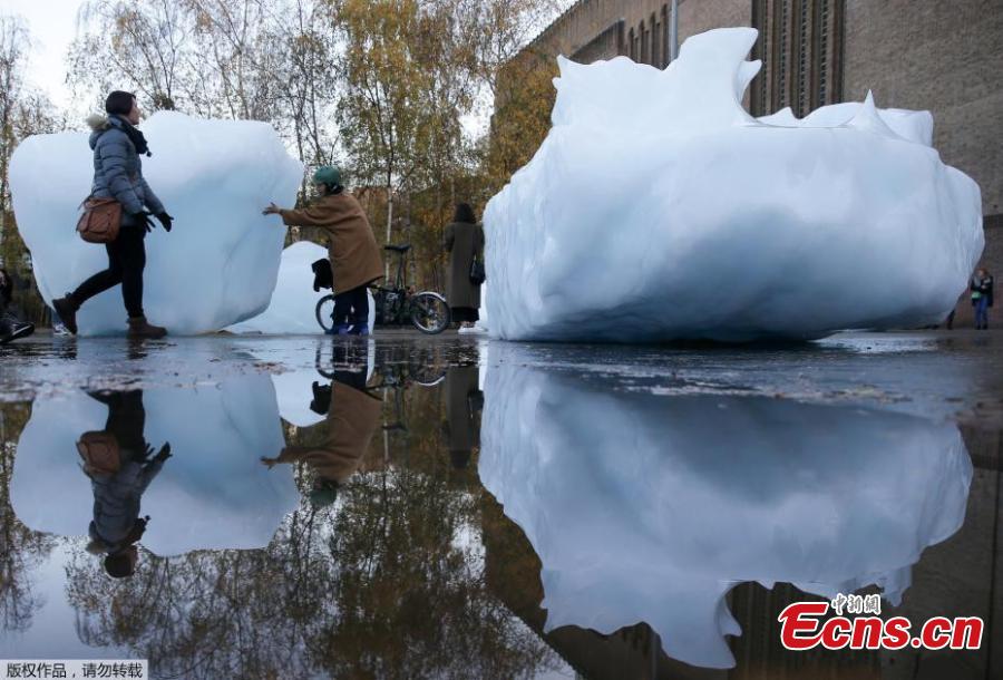 Ice Watch, a project by artist Olafur Eliasson and geologist Minik Rosing, in front of the Tate Modern in London, Dec. 12, 2018. Ice Watch is a display of 24 blocks of ice, fished out of the Nuup Kangerlua fjord in Greenland after becoming detached from the ice sheet. It's expected they will last between one week to 14 days before melting. It's hoped the project will help people better understand the reality of climate change. (Photo/Agencies)