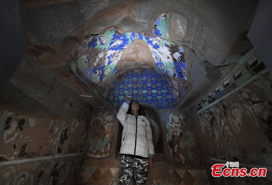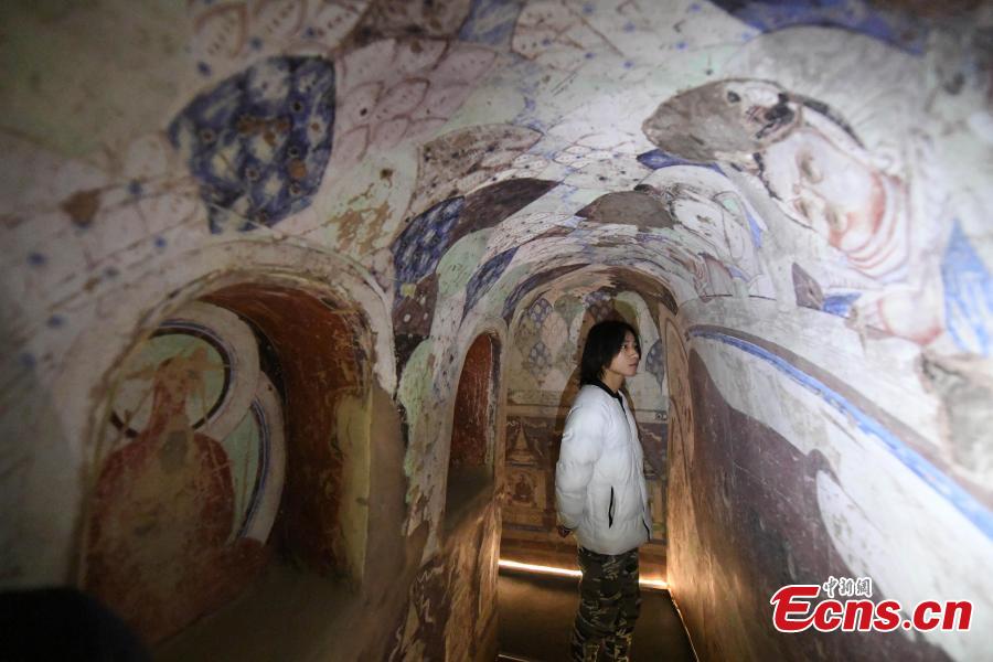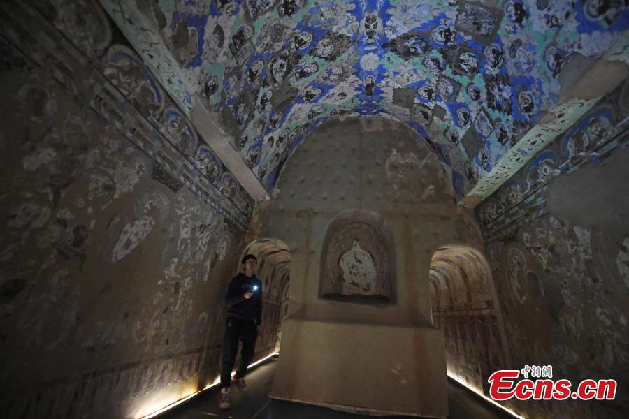 A visitor inside a life-size replica of a cave from the Kizil Caves in Northwest China’s Xinjiang Uygur Autonomous Region during an exhibition at Lanzhou University’s Yuzhong campus in Yuzhong County, Northwest China’s Gansu Province, December 13, 2018. Included in the exhibition were images of 137 murals, which were originally from the Kizil Caves but are now kept overseas, two replicas of original caves, and four digital caves. (Photo: China News Service/Yang Yanmin)