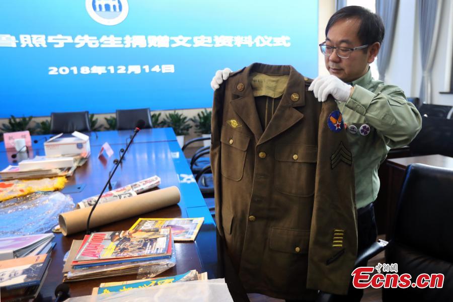 Chinese-American Lu Zhaoning donates historical materials to the Memorial Hall of the Aviator Martyrs in the War of Resistance against Japanese Aggression in Nanjing City, Jiangsu Province, Dec. 14, 2018. The relics included pilot’s suits, books by Flying Tiger pilots and other materials about WWII war planes. Lu’s relative Lu Meiyin served as a flight attendant in the war. The memorial hall shows the names and a basic introduction in Chinese, English and Russian on thousands of pilots from China, the United States and Soviet Union who died in China during the war. (Photo: China News Service/Yang Bo)