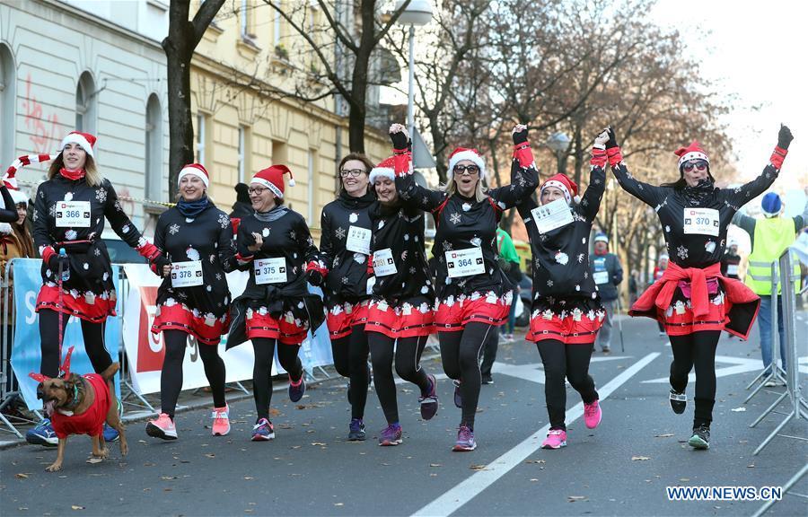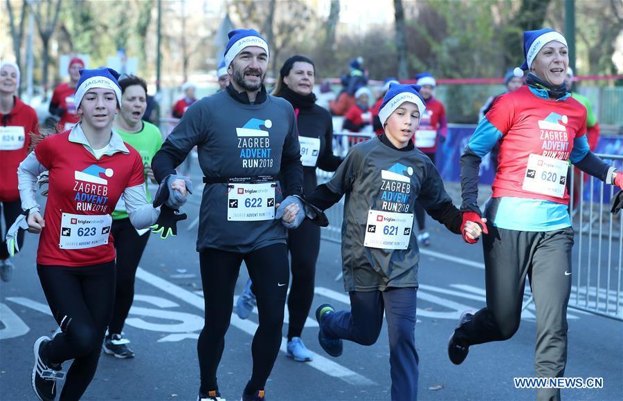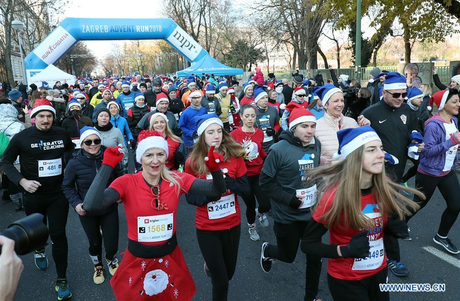 People take part in the third edition of Zagreb Advent Run in Zagreb, Croatia, on Dec. 16, 2018. More than 2,500 participants took part in the race on Sunday to raise funds for fighting diabetes. (Xinhua/Sanjin Strukic)