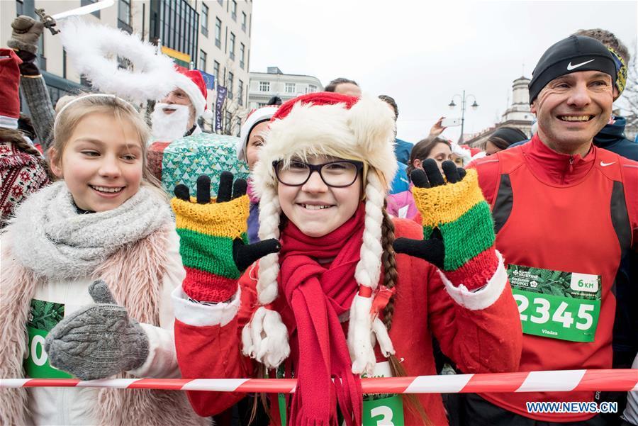 People attend the annual Christmas Run in Vilnius, Lithuania, on Dec. 16, 2018. About 3,500 people attended this year's race. (Xinhua/Alfredas Pliadis)