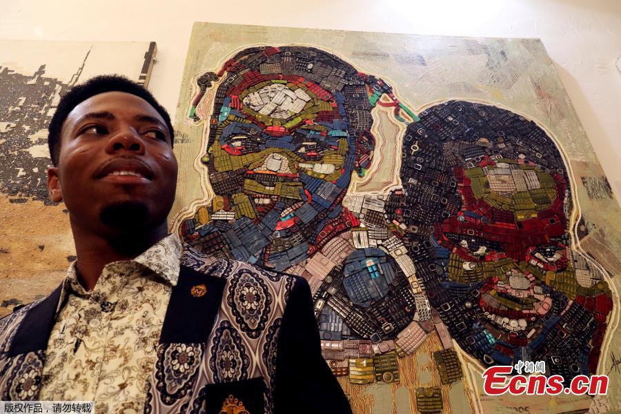 Desire Koffi, 24-year-old artist, poses next to his artwork during an exhibition in Abidjan, Ivory Coast, Dec. 1, 2018. Desire Koffi often walks through Koumassi, a popular district of Ivory Coast's main city Abidjan, to collect old mobile phones that he buys from people for 500 CFA francs ($0.8726) a pair. Back home, he dismantles the phones with a hammer to pull out the screens and keyboards. He uses them for his paintings. One can take him up to three or five days of work. (Photo/Agencies)