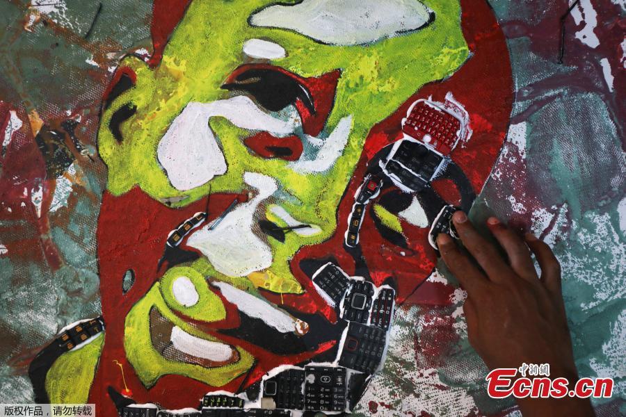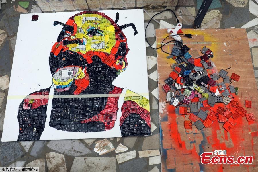Desire Koffi, 24-year-old artist, works at his workshop in Abidjan, Ivory Coast Dec. 3, 2018. Desire Koffi often walks through Koumassi, a popular district of Ivory Coast's main city Abidjan, to collect old mobile phones that he buys from people for 500 CFA francs ($0.8726) a pair. Back home, he dismantles the phones with a hammer to pull out the screens and keyboards. He uses them for his paintings. One can take him up to three or five days of work. (Photo/Agencies)