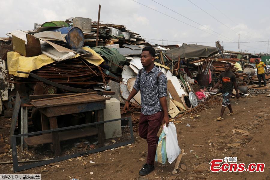 Desire Koffi, 24-year-old artist, walks at a recycling area in search of old mobile phones in Abidjan, Ivory Coast, Nov. 30, 2018. Desire Koffi often walks through Koumassi, a popular district of Ivory Coast's main city Abidjan, to collect old mobile phones that he buys from people for 500 CFA francs ($0.8726) a pair. Back home, he dismantles the phones with a hammer to pull out the screens and keyboards. He uses them for his paintings. One can take him up to three or five days of work. (Photo/Agencies)