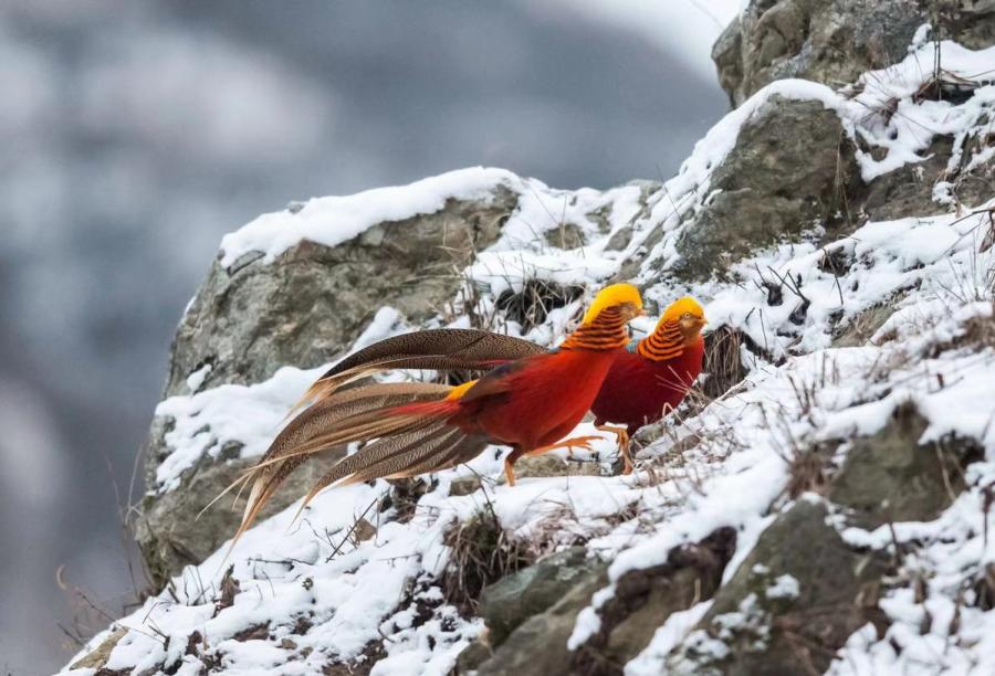 Golden pheasants, a bird species listed as a second-level protected wild animal, were seen by photographers in a snowy field in Sanmenxia city, Central China's Henan Province. (Photo by Zhang Rongfang for chinadaily.com.cn)