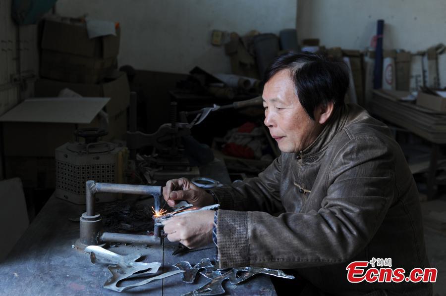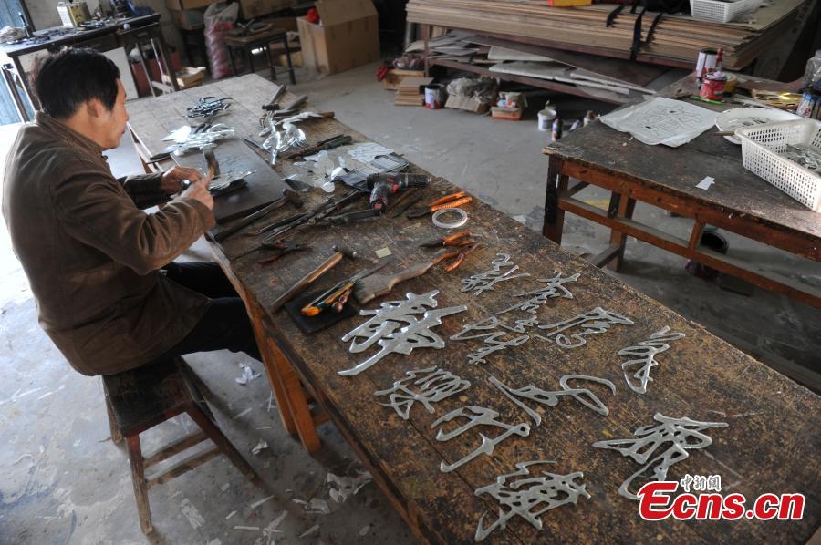 Deng Zhiyuan, a master of "Wushan Iron Calligraphy", works at his studio in Wushan Town of Changfeng County, east China's Anhui Province, on Dec. 17, 2018. "Wushan Iron Calligraphy" is a local specialty by cold forging Chinese characters with special skills to produce an effect of handwriting. Deng Zhiyuan, the 63-year-old artist has practiced the unique skill for over 30 years. (Photo: China News Service)
