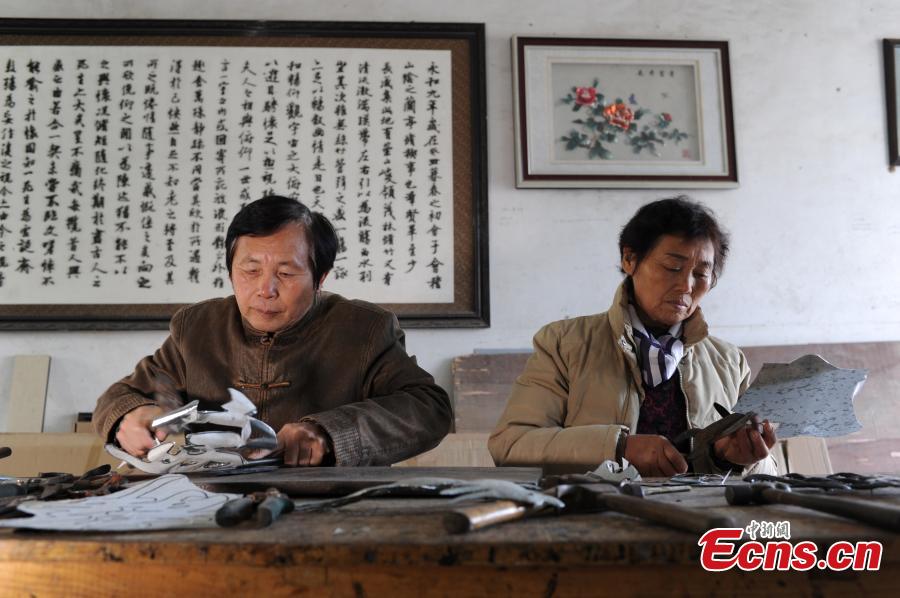 Deng Zhiyuan, a master of "Wushan Iron Calligraphy", and his wife work at his studio in Wushan Town of Changfeng County, east China's Anhui Province, on Dec. 17, 2018. "Wushan Iron Calligraphy" is a local specialty by cold forging Chinese characters with special skills to produce an effect of handwriting. Deng Zhiyuan, the 63-year-old artist has practiced the unique skill for over 30 years. (Xinhua/Zhang Duan)