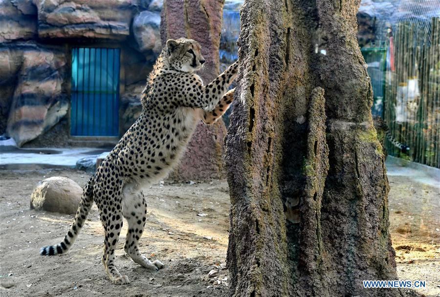A cheetah plays in the cheetah house at the Zhengzhou Zoo in Zhengzhou, capital of central China's Henan Province, Dec. 18, 2018. Zhengzhou Zoo has welcomed five couples of cheetahs from South Africa for the first time recently. (Xinhua/Li An)