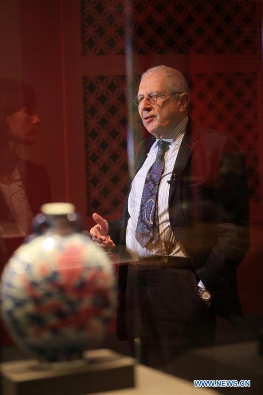 President of the Acropolis Museum Dimitrios Pandermalis visits the exhibition "From the Forbidden City: The imperial apartments of Qianlong" at the Acropolis Museum in Athens, Greece, Dec. 20, 2018. The exhibition, which consists of 154 exquisite works of art, ceremonial robes, furniture and objects from Beijing's Palace Museum, will last till Feb. 14, 2019. (Xinhua/Marios Lolos)