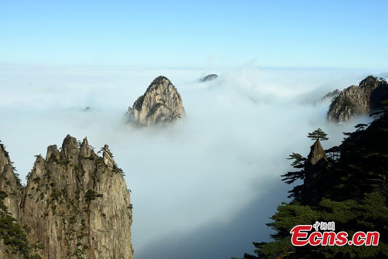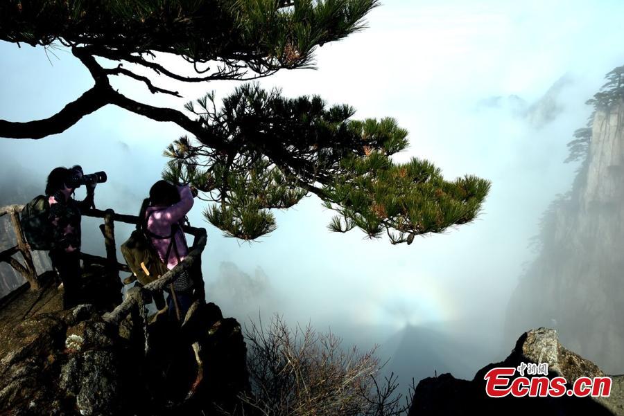 Mist and clouds surround Mount Huangshan in Anhui Province on Dec. 20, 2018. A UNESCO World Heritage site, the area is well known for its scenery, sunsets, peculiarly-shaped granite peaks, and pine trees. (Photo: China News Service/Wang Hui)
