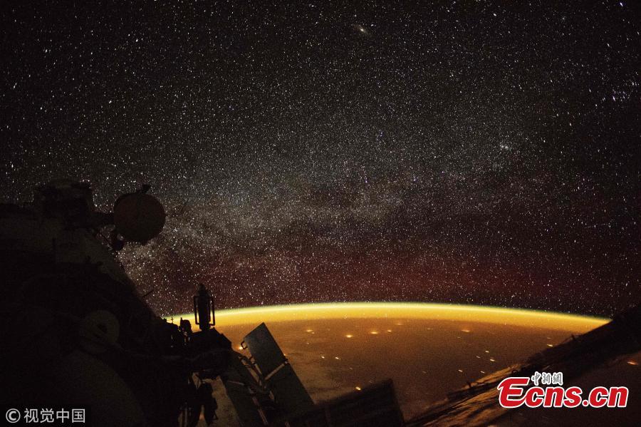 An orange hue envelops the Earth, known as "airglow," a phenomenon that occurs when ultraviolet radiation hits molecules in the atmosphere and creates a band of light that reaches 50 to 400 miles high, in this image taken on board the International Space Station (ISS), Oct. 7, 2018. (Photo/Agencies)