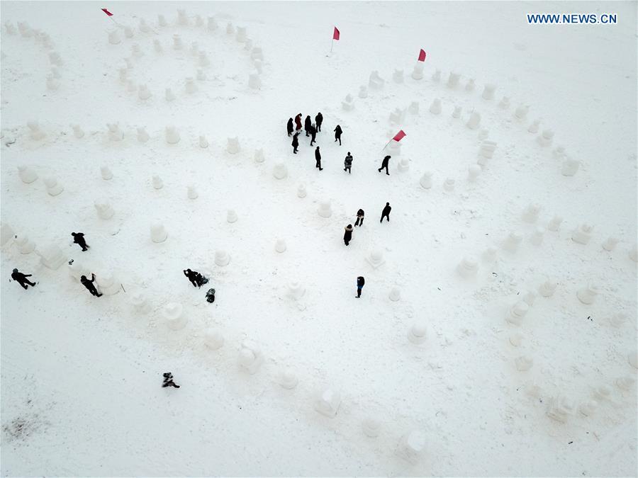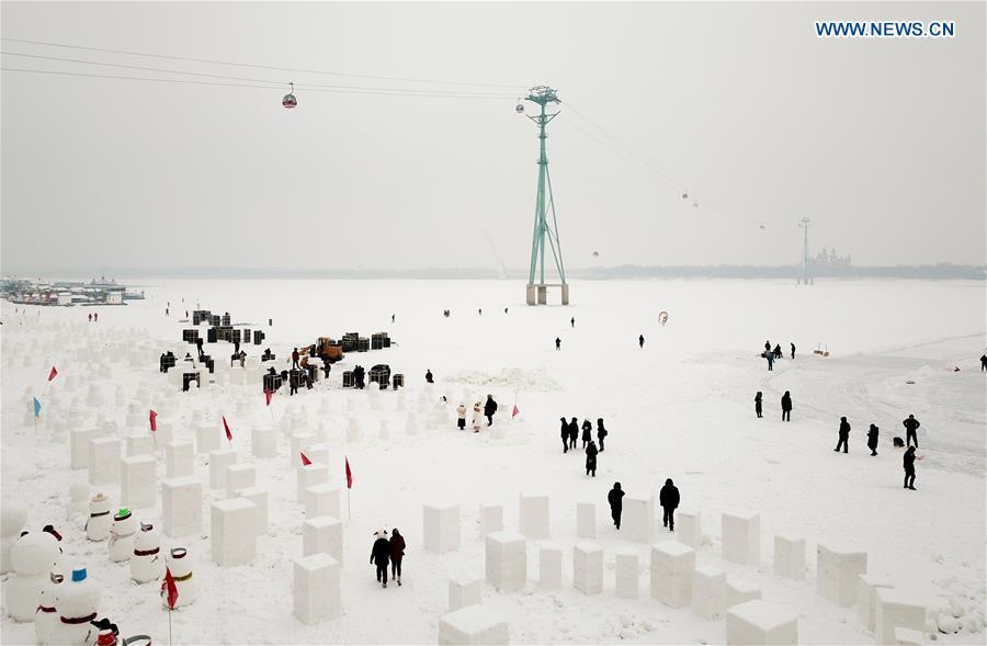 People make snowmen on the frozen Songhua River in Harbin, capital of northeast China's Heilongjiang Province, Dec. 21, 2018. Altogether 2,019 cute snowmen will be displayed here before January 1, 2019 to greet the new year. (Xinhua/Wang Song)