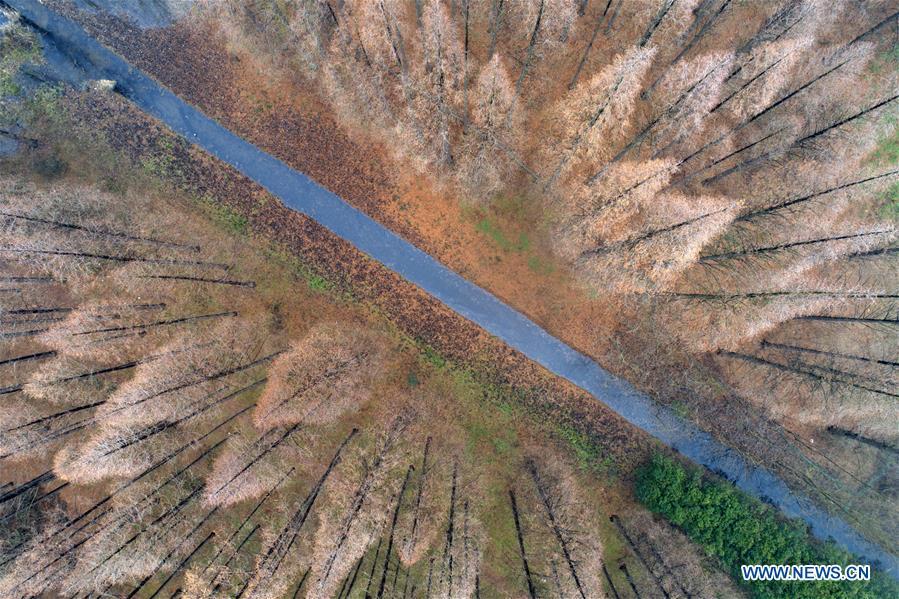 Aerial photo taken on Dec. 22, 2018 shows the scenery of the metasequoia forest in Sihong County of Suqian City, east China's Jiangsu Province. (Xinhua/He Jinghua)
