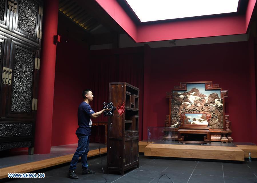 A staff worker measures and models a piece of old furniture by special instrument at an exhibition hall at the foot of southern rampart at the Palace Museum in Beijing, capital of China, July 6, 2018. The Palace Museum, or the former imperial palace in downtown Beijing, will open 85 percent of its areas to the public, compared with the current 80 percent, the China Daily reported Friday. Most of the areas inside the museum, also known as the Forbidden City, will no longer be off-limits for the public, the newspaper quoted Shan Jixiang, the museum's curator, as saying. The biggest of its kind in the world, the Forbidden City is gradually opening more of its coverage of 720,000 square meters to visitors in recent years. Only 30 percent of its areas were accessible by the public in 2012. Some rooms that had not been opened for decades were used as "lockers" that were strewn with items ranging from construction materials to daily necessities from imperial times, said the report. In recent years, many of these rooms have been renovated and transformed into exhibition halls. To ease the crowds at the museum, a cap on visitor numbers was set in June 2015, allowing 80,000 people a day to enter it. Visitors were also encouraged to buy tickets in advance online. (Xinhua/Jin Liangkuai)