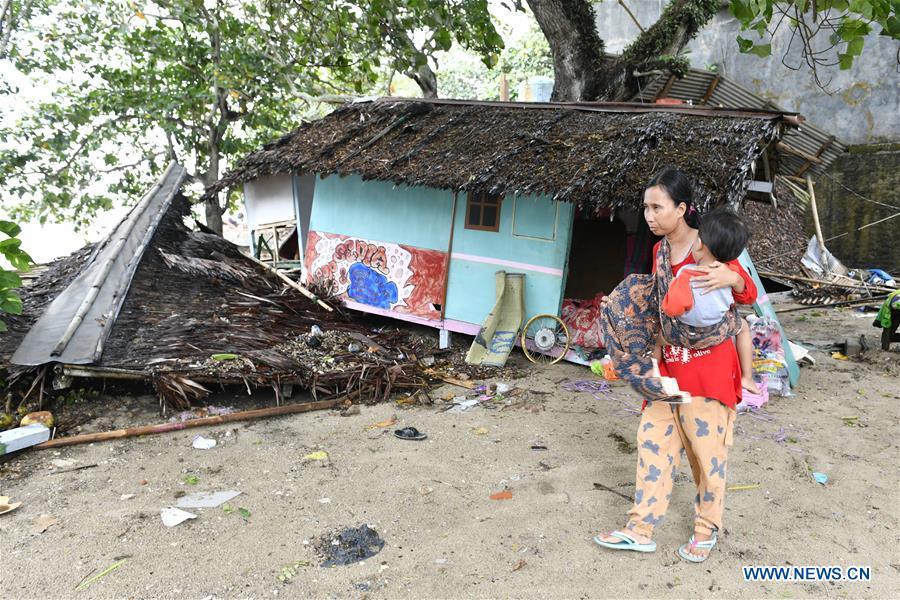 A woman holding her child walks by debris of a kiosk near the beach in Carita after a tsunami hit Sunda Strait in Pandeglang, Banten province, in Indonesia, Dec. 23, 2018. The total casualty of a tsunami triggered by the eruption of Krakatau Child volcano has increased to 222 people in coastal areas of Sunda Strait of western Indonesia, disaster agency official said here on Sunday. The catastrophe killed at least 222 people, wounded at least 843 ones and collapsed a total of 556 houses and nine hotels, and caused damages to scores of ships. (Xinhua/Veri Sanovri)