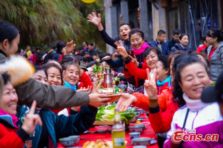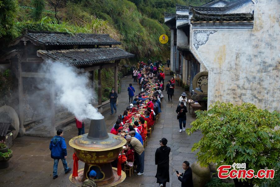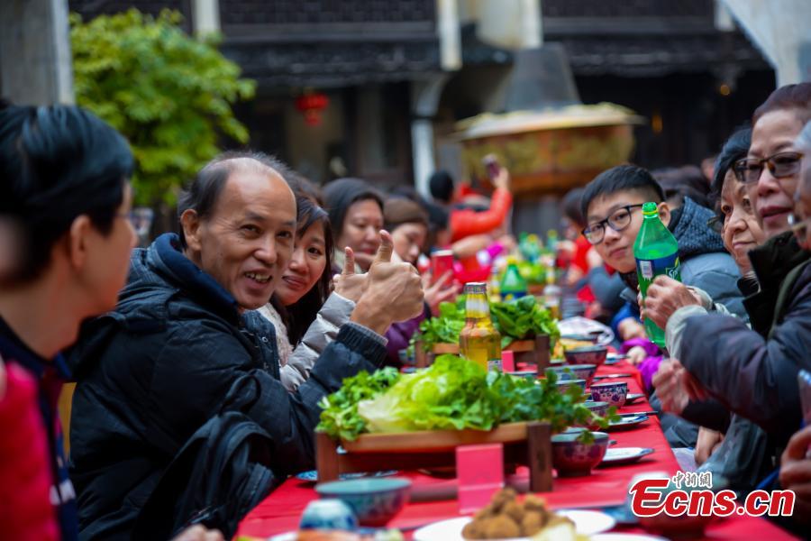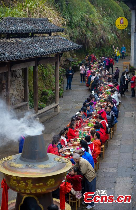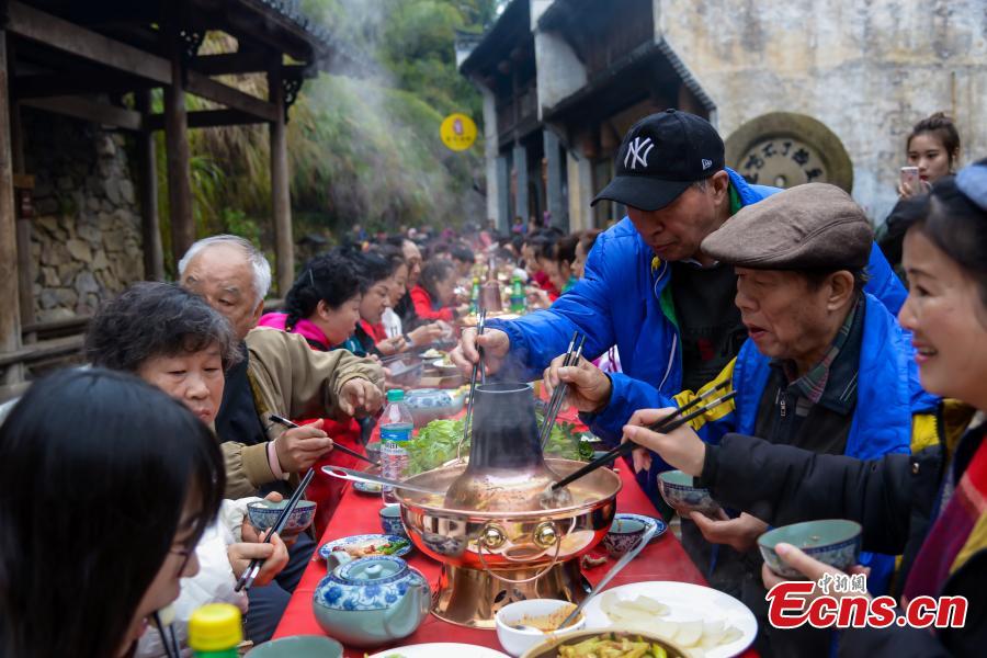 A hot-pot banquet is held on a street in Huangling Ancient Village in Wuyuan County, East China's Jiangxi Province, Dec. 22, 2018. The centerpiece of the long-table banquet, a traditional manner in which to celebrate some major festivals and entertain guests, is a giant copper pot measuring three meters in height and two meters in diameter. Visitors, including some from Singapore and Malaysia, joined the feast, where the tables extended for 100 meters. (Photo: China News Service/Fang Huabin)