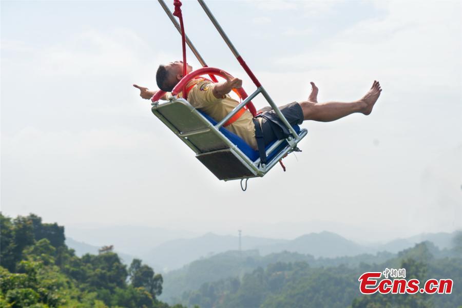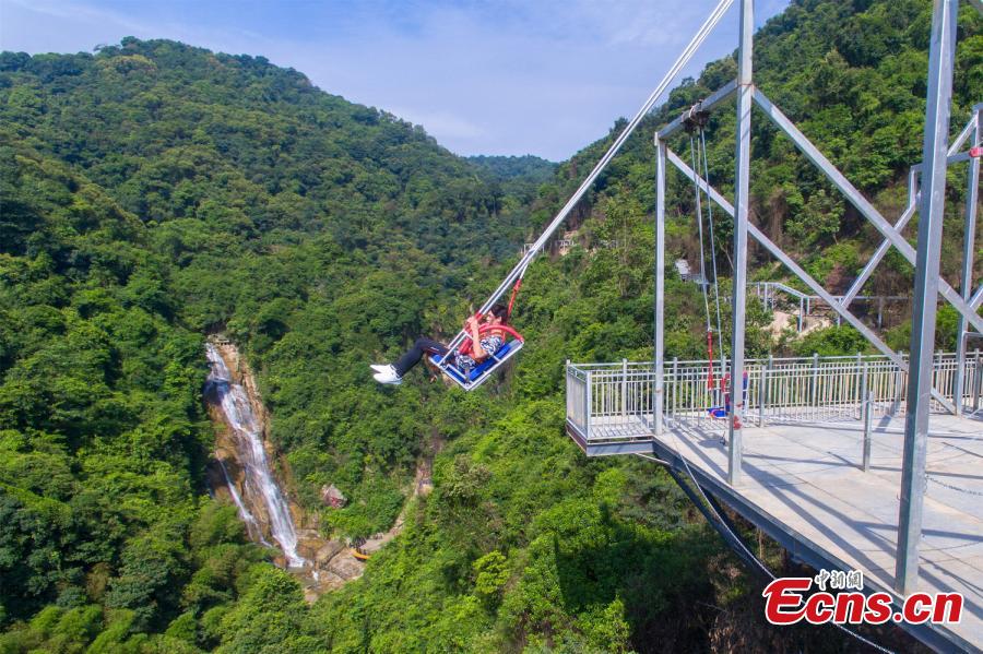 Photo shows a tourist experiencing the cliff swing that officially opened to the public in Qingyuan, Guangdong Province on December 19, 2018. The swing above a 198-meter waterfall on Mount Tianzi in Qingyuan, South China's Guangdong Province officially opens on Thursday after a four-month trial operation. (Photo: China News Service/Cheng Jingwei)