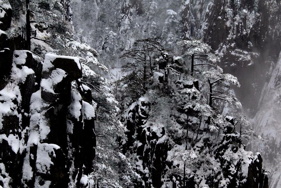 Huangshan Mountain scenic area in Anhui province is shrouded in a mantle of white after a snowfall, Jan. 1, 2019. Clouds and misty air envelop the towering mountain peaks, creating a breathtakingly beautiful scene. (Photo/Asianewsphoto)