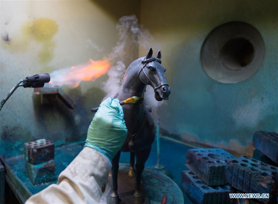 A craftsman makes copper horse at a factory workshop in Jiande City, east China's Zhejiang Province, Jan. 2, 2019. A traditional sanitary ware production company, Tong Shifu, meaning Copper Master, has converted itself into an enterprise that designs and makes copper artwork in collaboration with museum, cartoon firm and artist's studio. With the annual output reaching 500 million yuan (about 72.9 million U.S. dollars), the company has succeeded in industrial transformation. (Xinhua/Weng Xinyang)