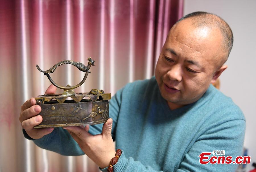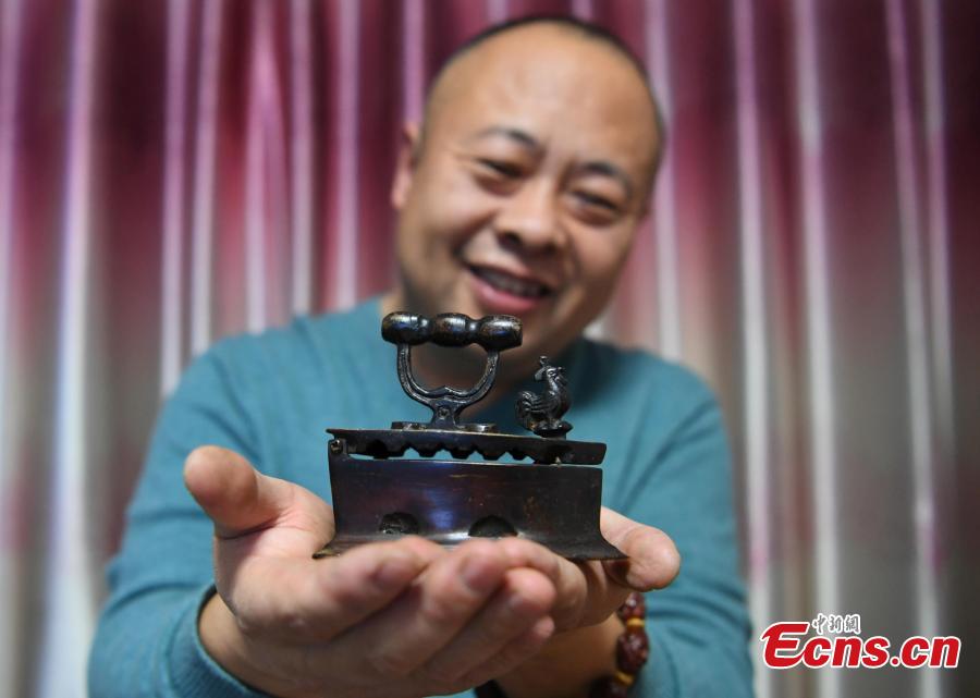 Teng Yongshan of Jilin City in Jilin Province shows his collection of irons - a collection he began in 2000. The former teacher has collected more than 40 irons that were made during the Jin (1115-1234) to Qing Dynasties (1368-1644) and in the early Republic period. Some of the irons were imported into China, including some from Japan and Germany. (Photo: China News Service/Zhang Yao)
