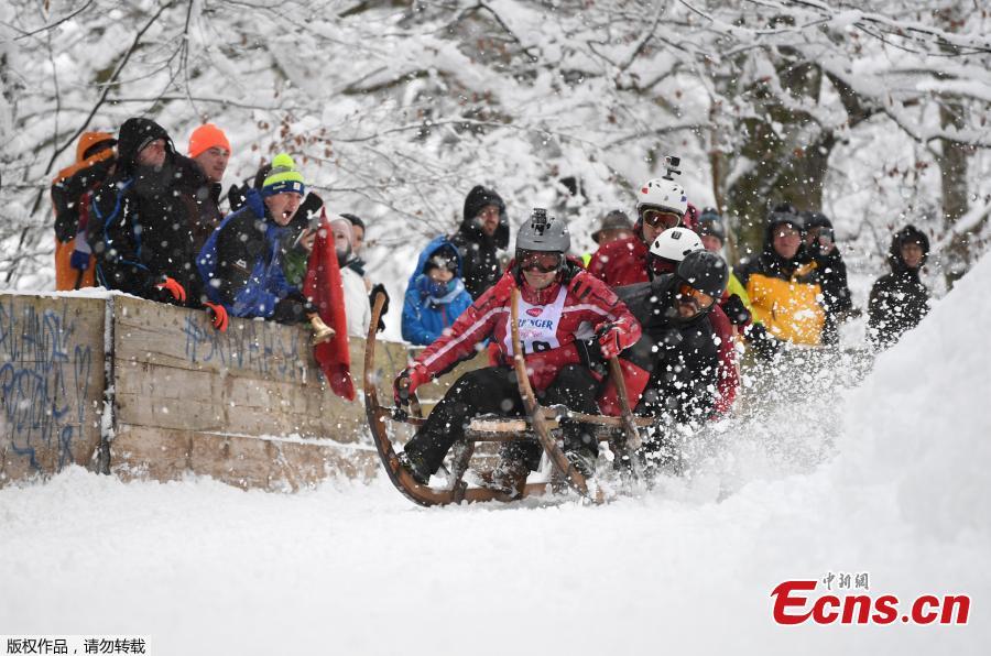 Participants of the 50th horn sled competition race down the mountain and fall off their sledge in the Bavarian town of Garmisch-Partenkirchen, Germany, Jan. 6, 2019. (Photo/Agencies)