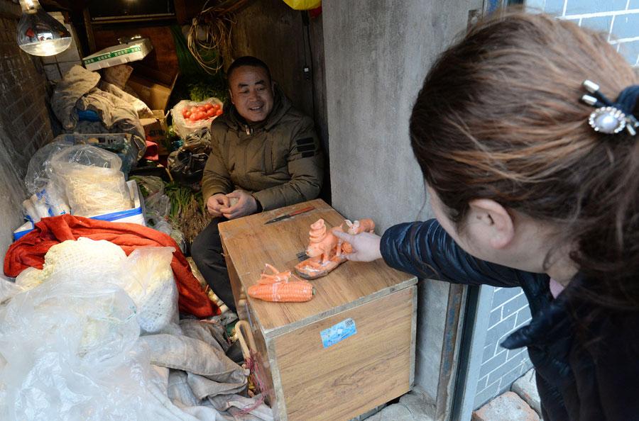 A customer shows interest in sculptures carved out of carrots by Guo Yuhong, a Hebei vegetable vendor. (Photo by Hao Qunying for chinadaily.com.cn)