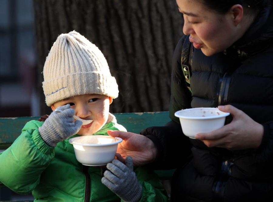 Visitors and tourists taste Laba porridge at Yonghe Temple, Beijing, on Jan. 13, 2019. (Photo/China Daily)
