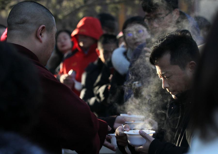 It was the eighth day of the 12th month of the Chinese lunar calendar, and Yonghe Temple opened to the public free of charge and distributed the porridge to mark the occasion.
