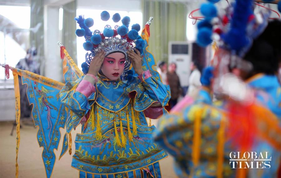 A student adjusts her costume in front of a mirror. (Photos: Yang Hui/GT)